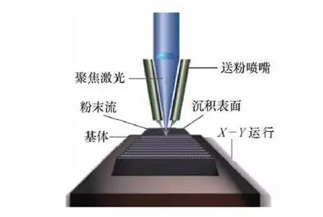 激光立體成形技術(shù)((Laser Solid Forming,LSF)是通過快速成型技術(shù)和激光熔覆技術(shù)有機結(jié)合,利用高能量激光束將與光束同軸噴射或側(cè)向噴射的金屬粉末直接熔化為液態(tài),通過運動控制,將熔化后的液態(tài)金屬按照預(yù)定的軌跡堆積凝固成形,獲得從尺寸和形狀上非常接近于最終零件的“近形”制件。
